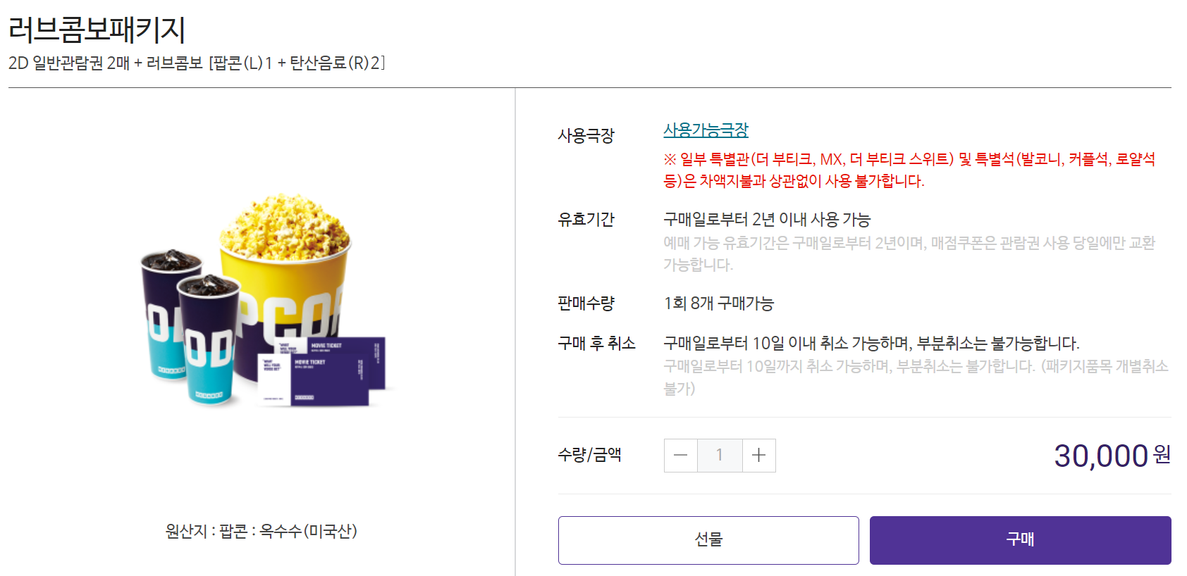 2. 러브 콤보 패키지 - 가격은 30,000원이며, 2D 일반영화관람권 2매 + 러브콤보팝콘(L) 1개 + 탄산음료(R) 2개입니다.