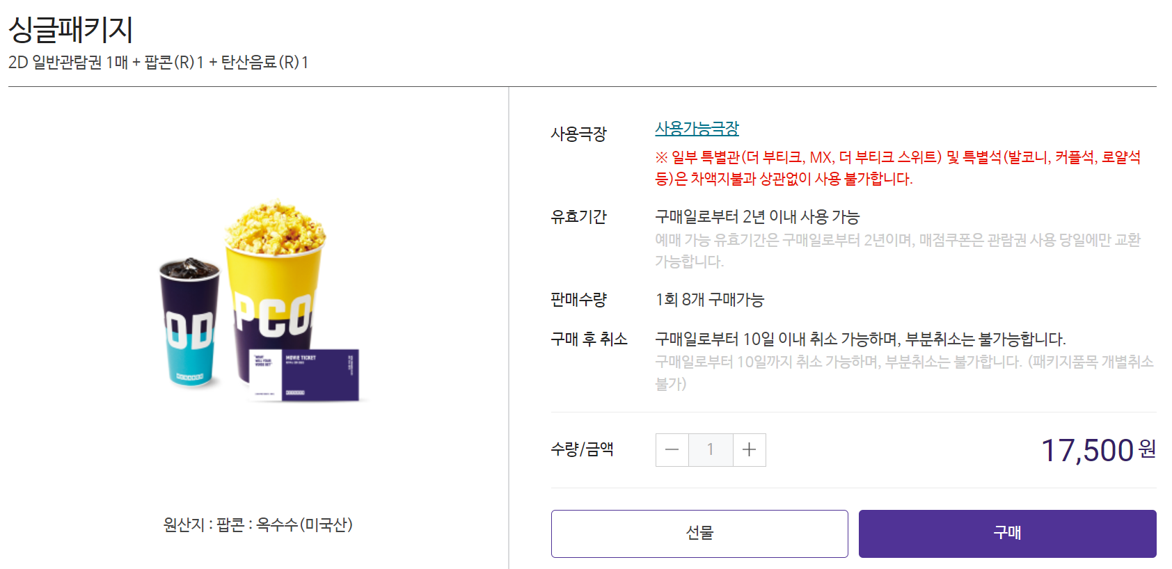 1. 싱글 패키지 - 가격은 17,500원이며, 2D 일반영화관람권 1매 + 팝콘(R) 1개 + 탄산음료 (R) 1개입니다.