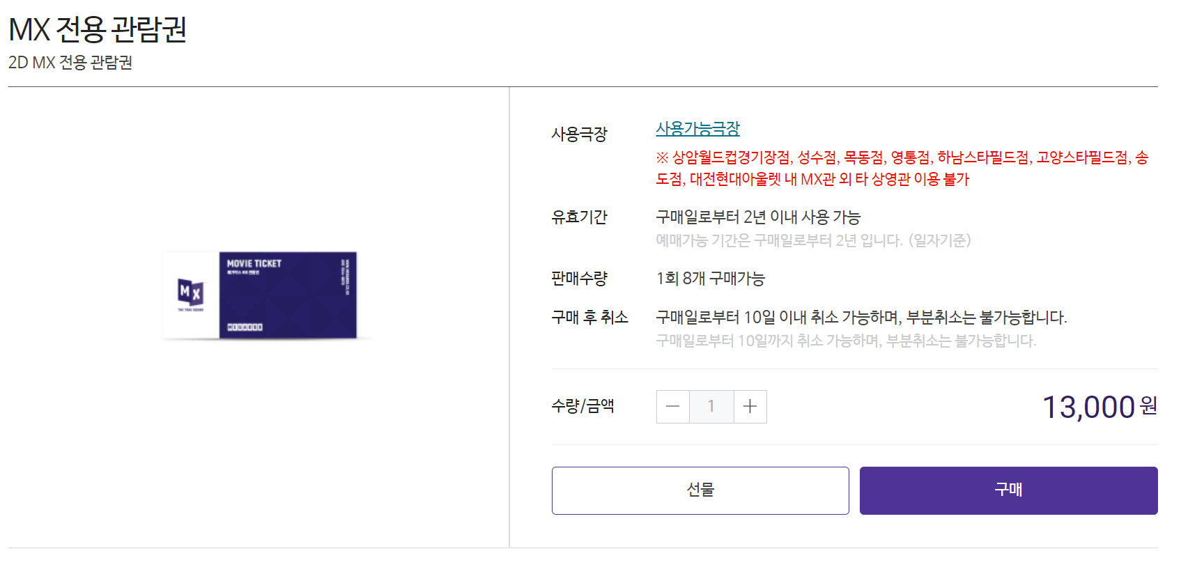 3. MX 전용 관람권(2D) - 가격 13,000원