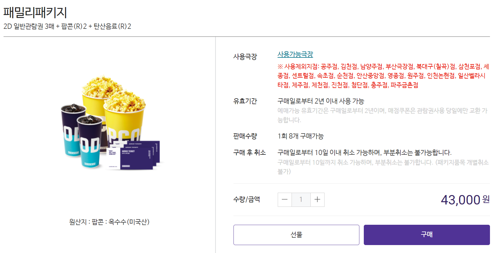 3. 패밀리 패키지 - 가격은 43,000원이며, 2D 일반영화관람권 + 팝콘(R) 2개 + 탄산음료(R) 2개입니다.