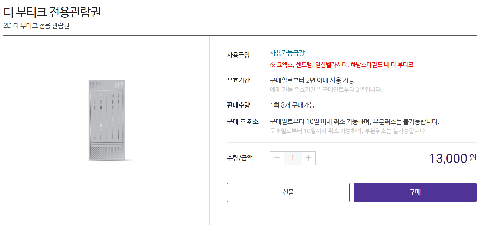 2. 더 부티크 전용관람권(2D) - 가격 13,000원