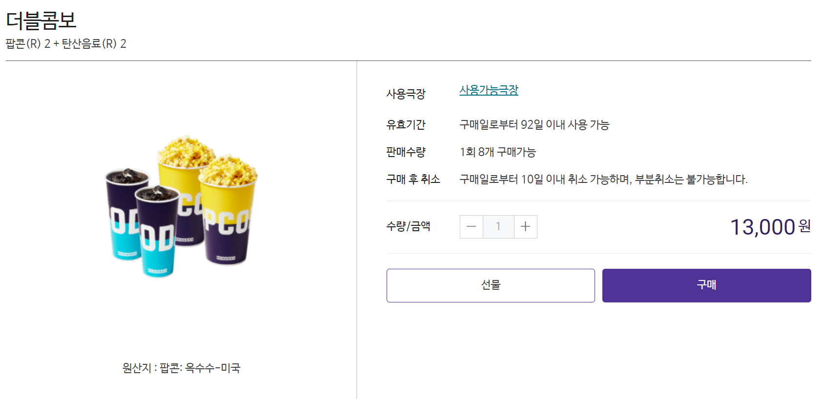 2. 더블 콤보 - 가격은 13,000원이며, 팝콘(R) 2개 + 탄산음료(R) 2개이며, 팝콘과 탄산음료 종류는 선택하실 수 있습니다.