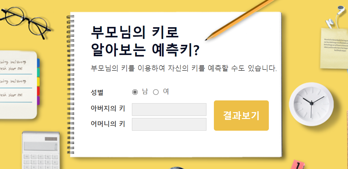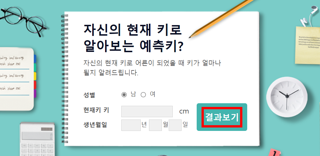 위의 그림과 같이 자신의 현재키로 알아보는 예측키가 나오며, 현재 키와 생년월일의 빈칸을 입력해주시면 예상키 계산을 하실 수 있습니다.