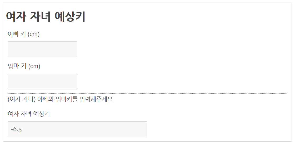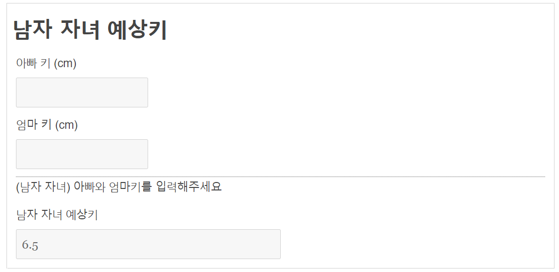 위의 빈칸에 아빠 키와 엄마 키 입력을 해 주시면 자녀 예상키 계산을 하실 수 있습니다.