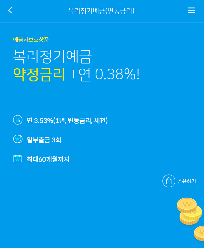 복리정기예금(변동금리)는 첫 번째- 연 3.53%(1년, 변동금리, 세전), 두 번째- 일부 출금 3회, 세 번째- 최대 60개월까지 가능