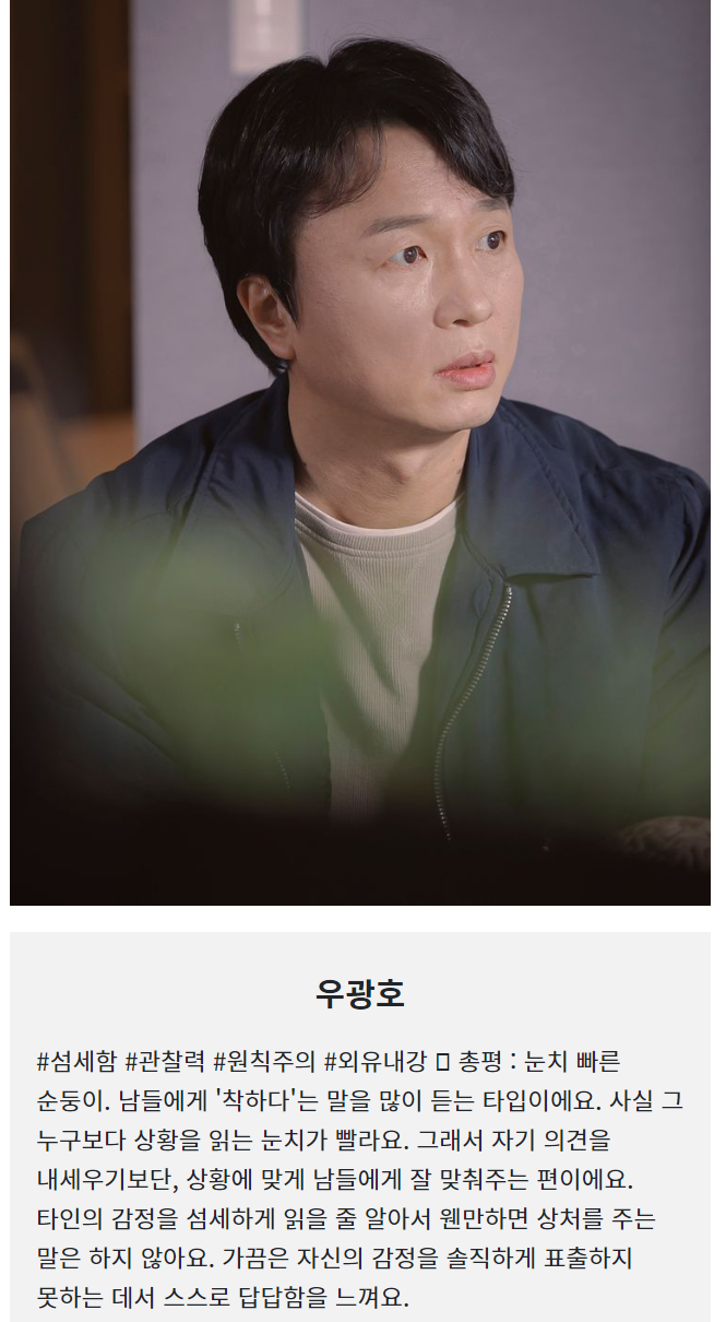 우광호(우영우의 아빠)는 섬세함, 관찰력, 원칙주의, 외유내강의 결과가 나왔습니다.