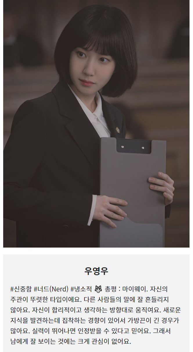 우영우 테스트는 드라마 속 주인공 중에서 누구일지 알아보는 테스트입니다.