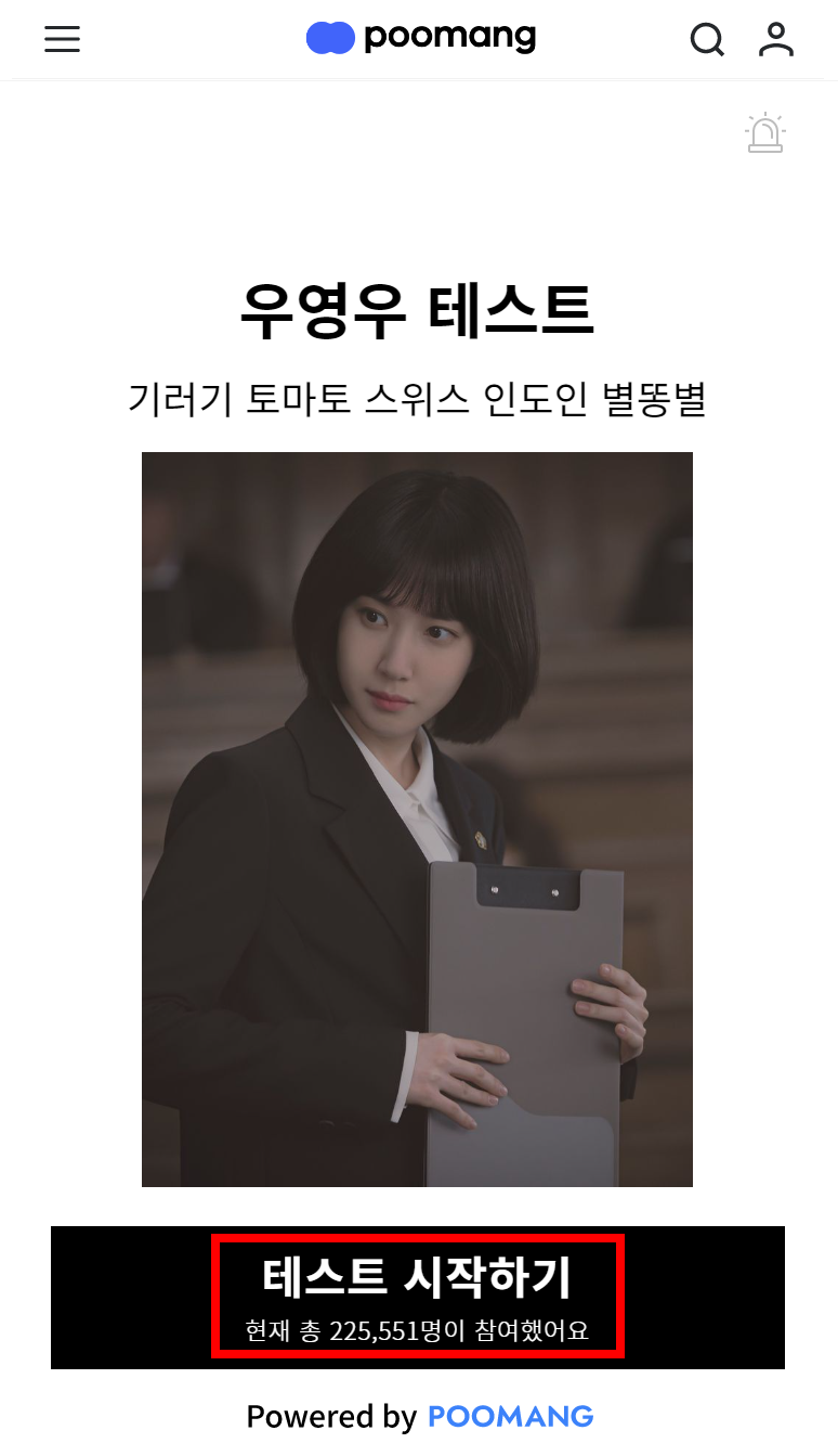 ↑ ↑ ↑ 위의 링크나 버튼을 통해서 이상한 변호사 우영우 테스트를 시작하실 수 있습니다.