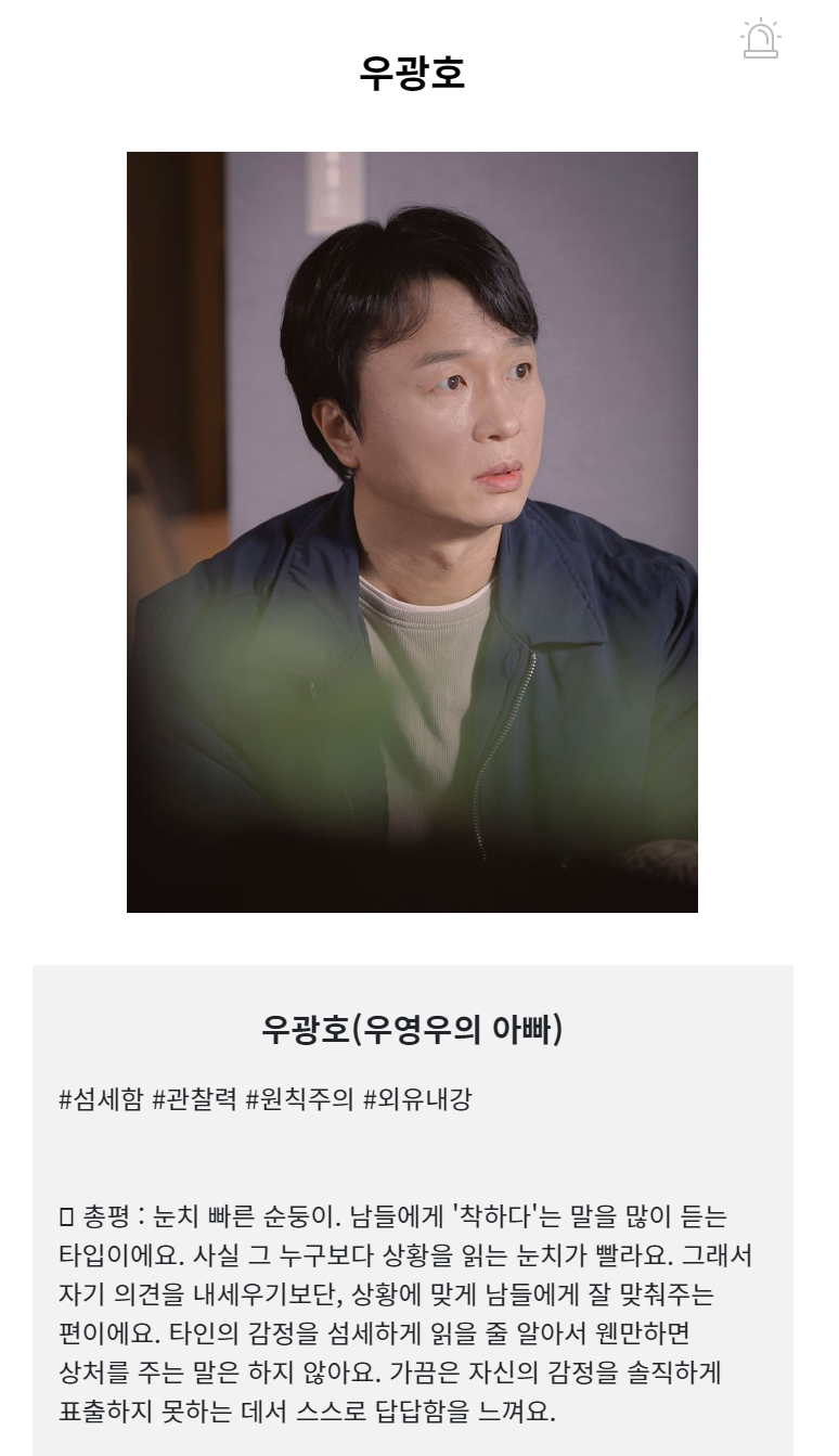 우광호(우영우의 아빠)는 섬세함, 관찰력, 원칙주의, 외유내강의 결과가 나왔습니다.