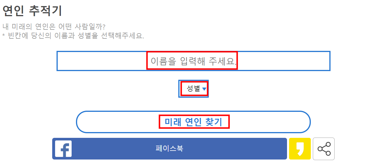 빈칸에 순서대로 본인의 이름을 입력해주시고, 성별을 선택해주신 다음 '미래 연인 찾기' 버튼을 클릭해주면 됩니다.