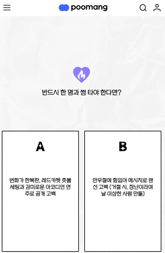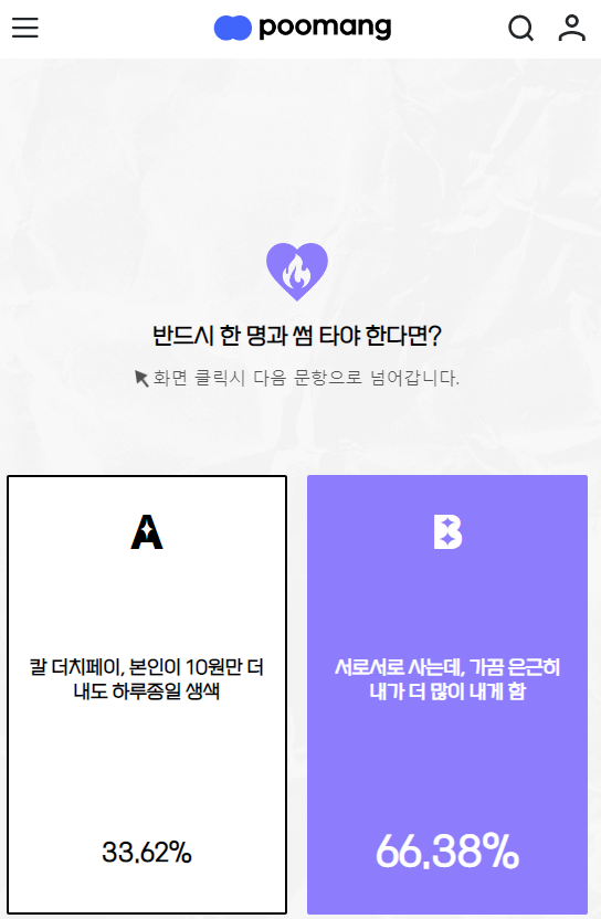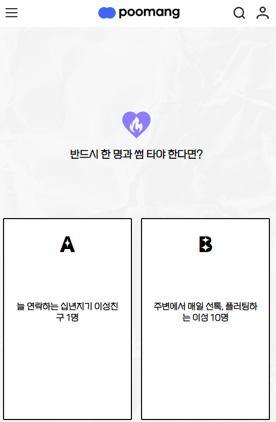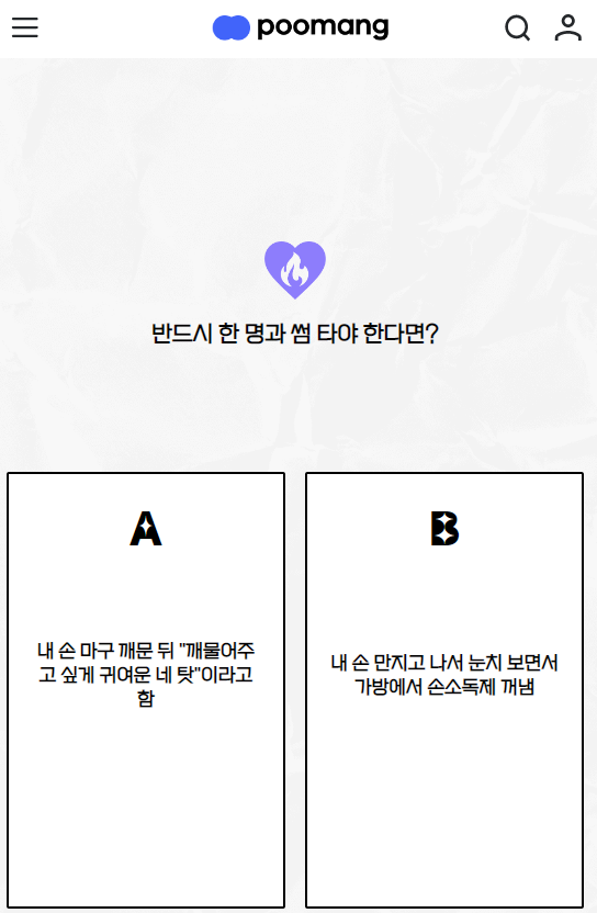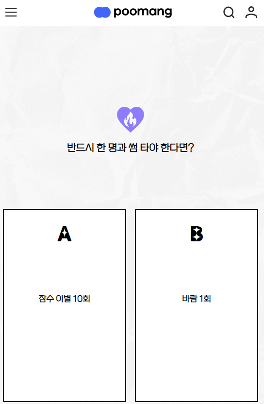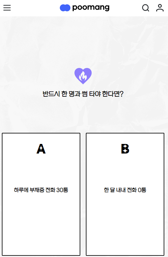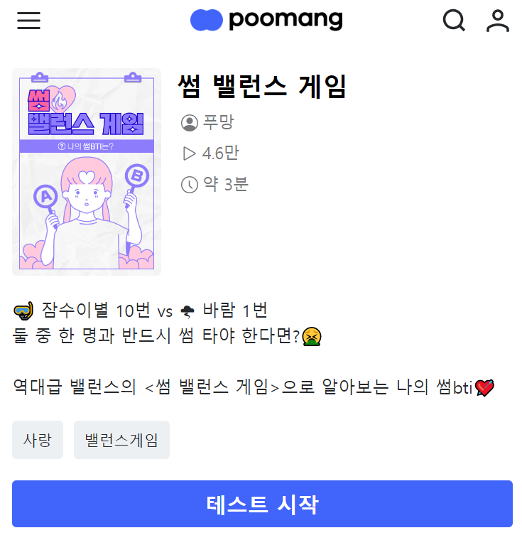 푸망(poomang) 홈페이지에서 썸 밸런스 게임 테스트가 나왔으며, 밸런스 게임처럼 2가지 중에서 1개를 선택하는 테스트입니다.