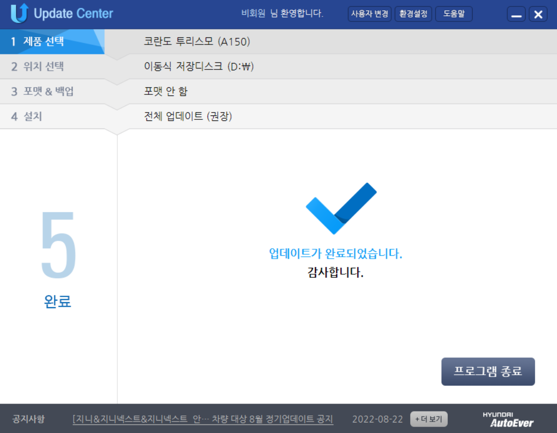 5. 쌍용자동차 네비게이션 업데이트가 완료되었습니다. 라는 완료 창이 나오며, 프로그램 종료를 해주시면 됩니다.
