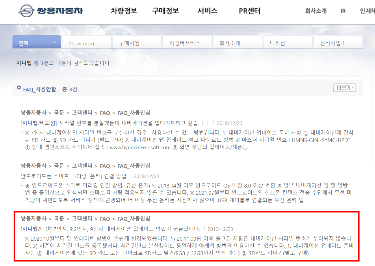 검색된 3개의 목록 중에서 가장 아래에 목록을 클릭해주시면 됩니다. '[지니맵/디젠] 7인치, 9.2인치, 9인치 내비게이션 업데이트 방법이 궁금합니다.'