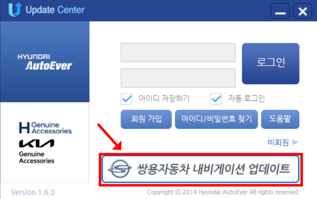 회원가입 또는 로그인을 하지 않으셔도 되며, Update Center 아래의 '쌍용자동차 내비게이션 업데이트'를 클릭해주시면 됩니다.