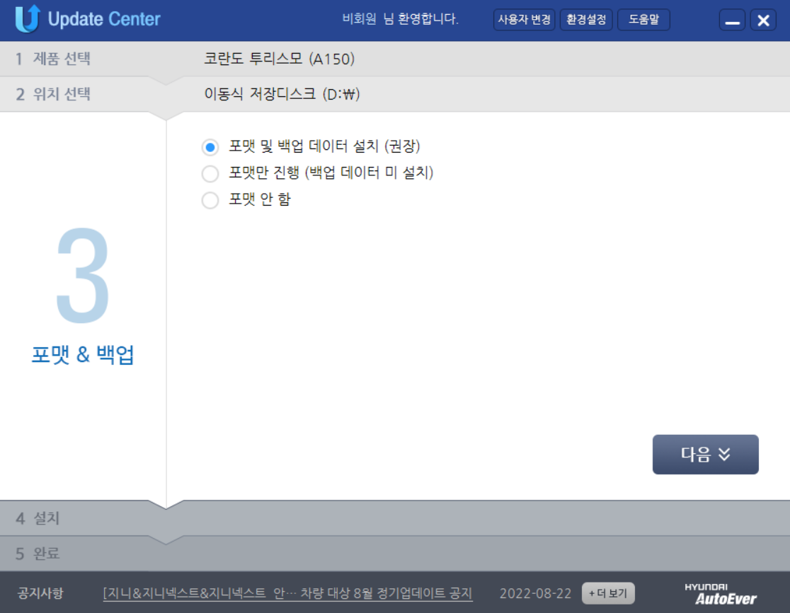 3. 포맷 및 백업 데이처 설치(권장) 체크를 해주시고 '다음'으로 진행해주시면 됩니다.