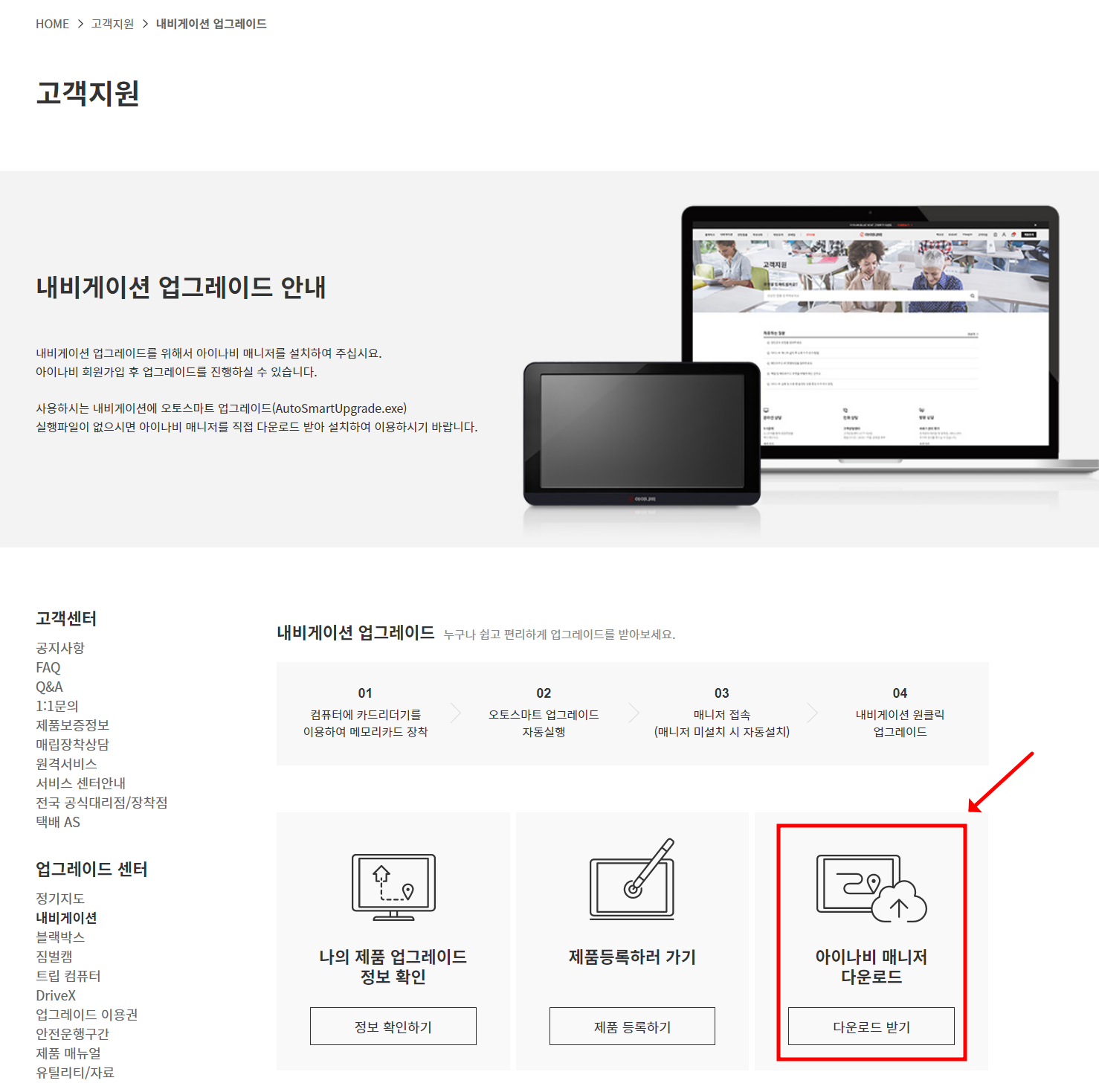 아이나비 홈페이지의 고객지원-내비게이션 업그레이드까지 들어오셨다면, '아이나비 매니저 다운로드' 다운로드 받기를 클릭하여 아이나비 매니저 프로그램을 설치하시면 됩니다.