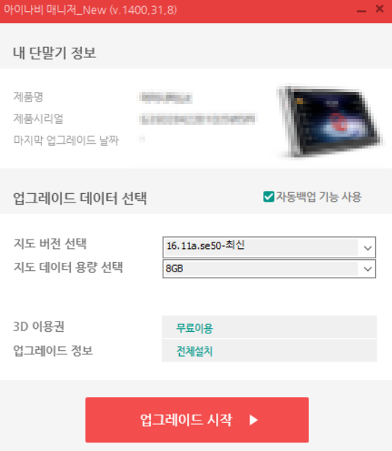아이나비 매니저 프로그램으로 돌아가 로그인을 해준 다음 '내비게이션 업그레이드'를 클릭해주시면 됩니다.