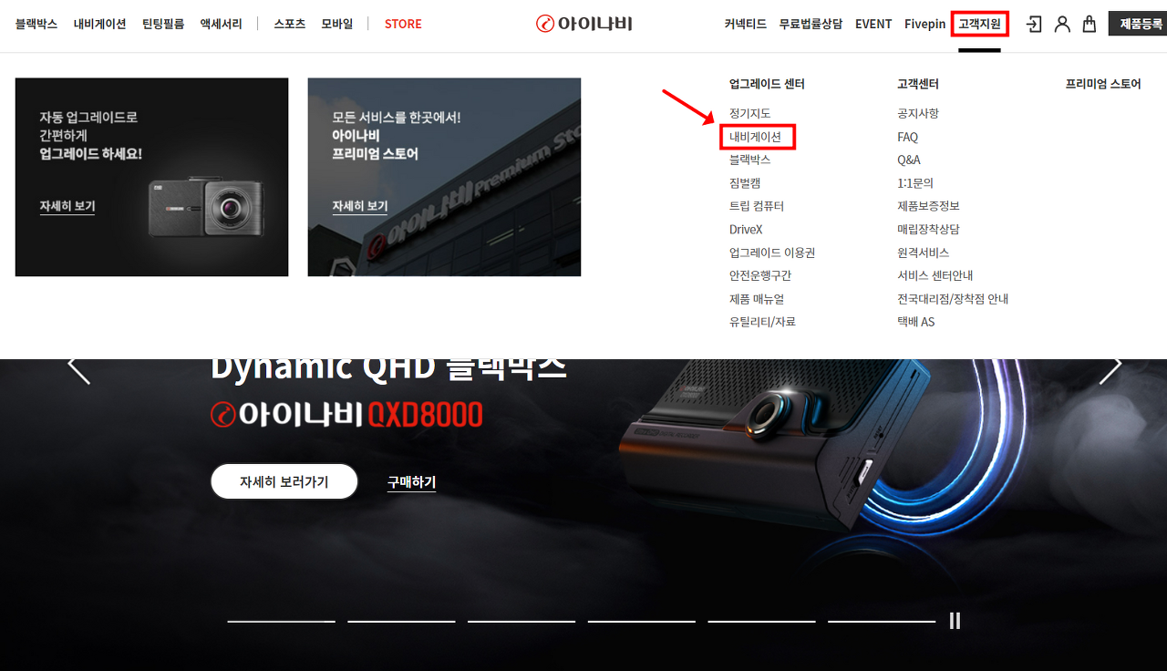 아이네비 홈페이지에 들어가주셨다면, 우측 상단에 '고객지원' 클릭하시고 다음으로는 업데이트 센터의 '내비게이션'을 클릭해주시면 됩니다.