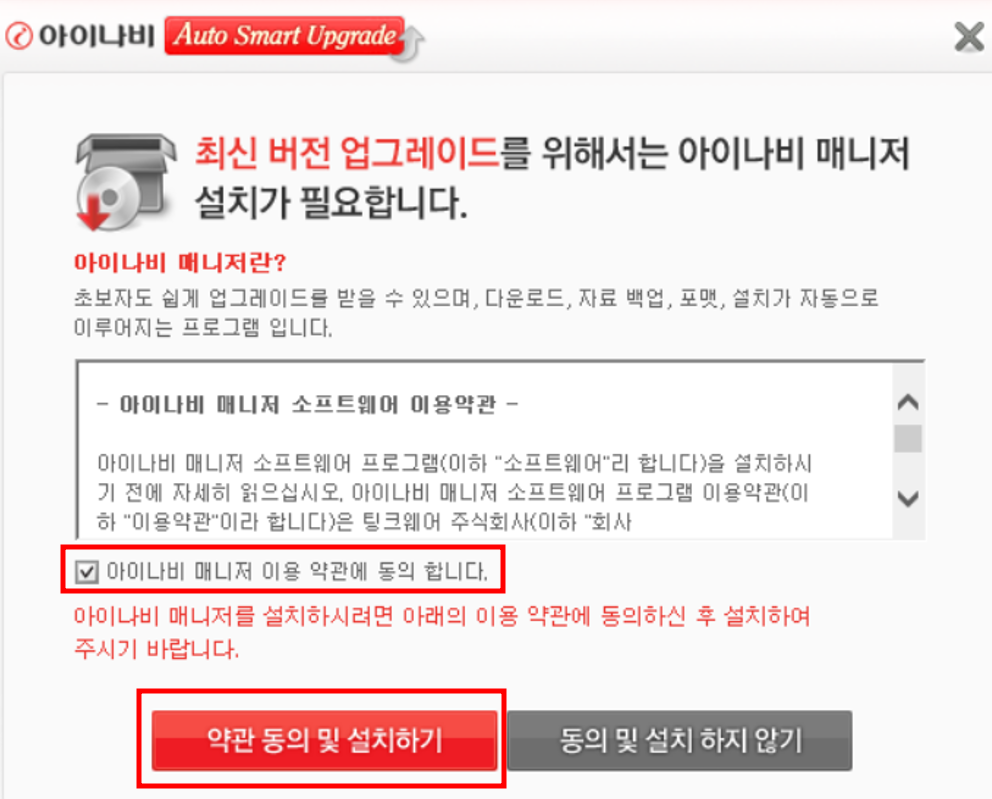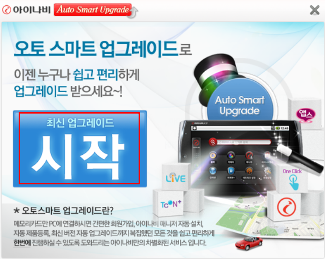 오토 스마트 업그레이드 창이 나오며, 최신 업그레이드 '시작' 버튼을 클릭해주시고, 다음으로는 아이나비 매너지 이용 약관 동의 및 설치 버튼을 클릭해주시면 됩니다.