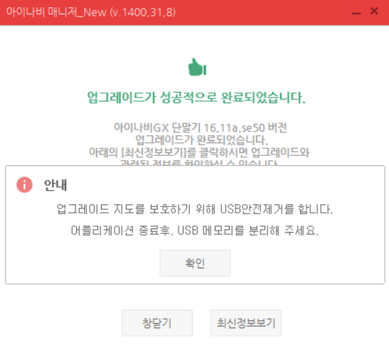 업그레이드 지도를 보호하기 위해 USB 안전제거를 하여 아이나비 매니저를 종료하여, USB 메모리를 분리해주시면 됩니다.