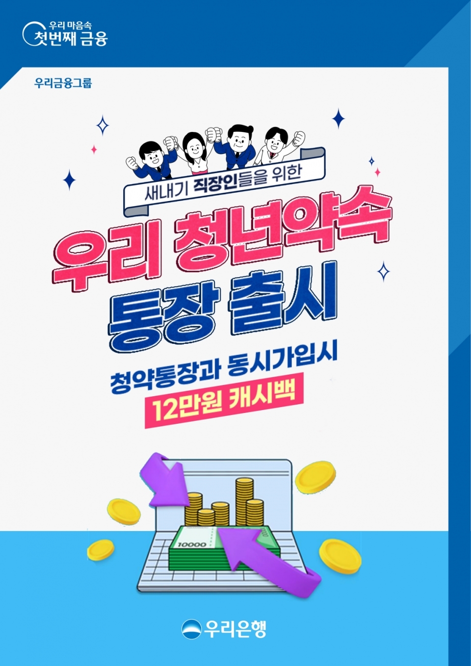 - 무주택 청년을 위한 급여 통장이며, 우리은행에서 최대 12만원의 캐시백 지원금과 우리은행 수수료 면제 혜택을 받을 수 있는 '우리 청년 약속 통장'입니다.