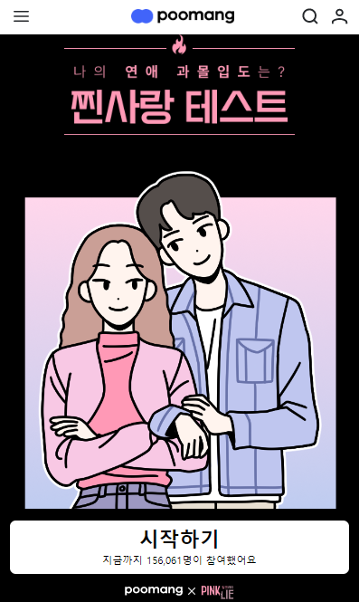 찐사랑 테스트는 푸망(poomang) 홈페이지에서 디즈니 플러스 핑크라이(PinkLie)와 같이 협업을 해서 만들었다고 합니다.