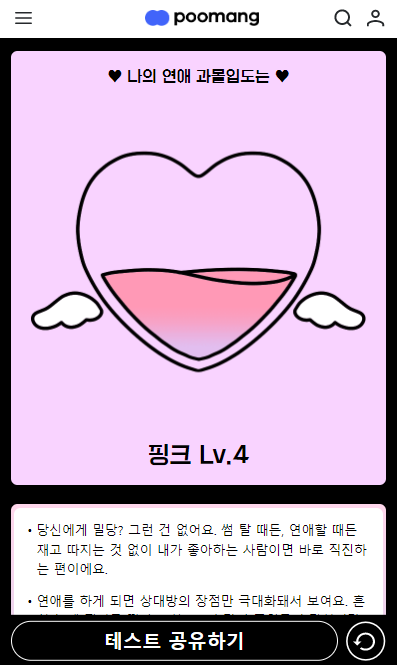 찐사랑 테스트 결과 나의 연애 과몰입도는 '핑크 Lv.4'가 나왔습니다.