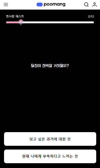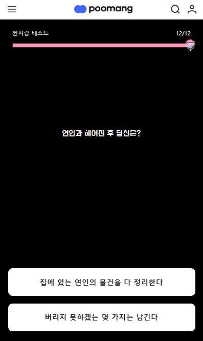 찐사랑 테스트 문항 수는 총 12문항이며, 테스트 소요 시간은 약 5~7분 정도 걸립니다.