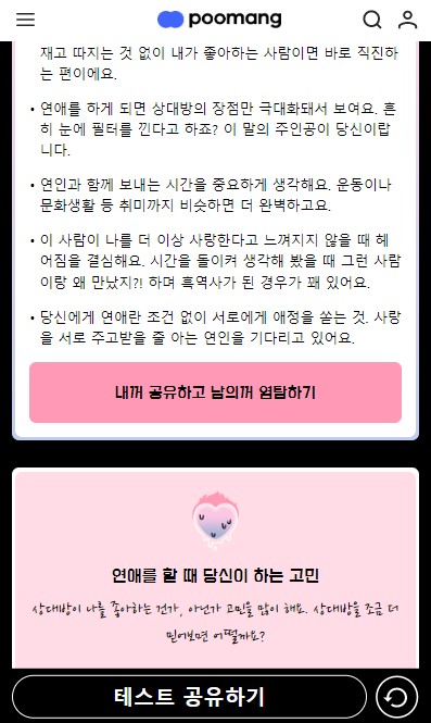 푸망(poomang) 홈페이지에서 '찐사랑 테스트'를 실시하실 수 있으며, PC, 노트북이나 모바일에서 '찐사랑 테스트'를 실시하실 수 있습니다.