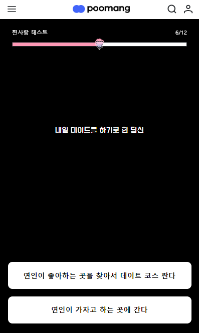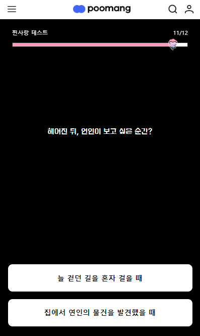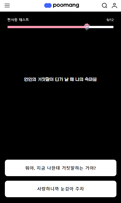 찐사랑 테스트 문항 수는 총 12문항이며, 테스트 소요 시간은 약 5~7분 정도 걸립니다.