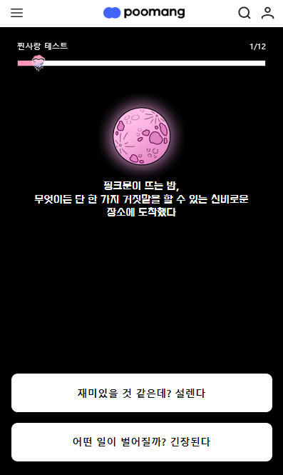 푸망(poomang) 홈페이지에서 '찐사랑 테스트'를 실시하실 수 있으며, PC, 노트북이나 모바일에서 '찐사랑 테스트'를 실시하실 수 있습니다.