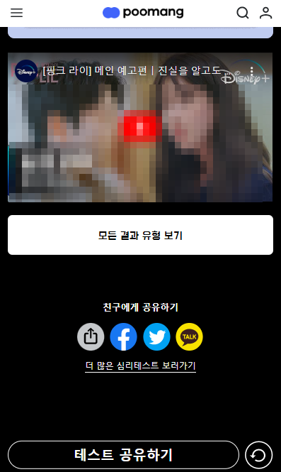 찐사랑 테스트 결과 친구들에게 SNS을 이용하여 공유하실 수 있으며, 찐사랑 테스트의 모든 결과 유형을 확인 해 보실 수도 있습니다.