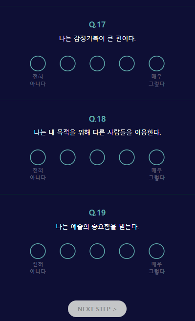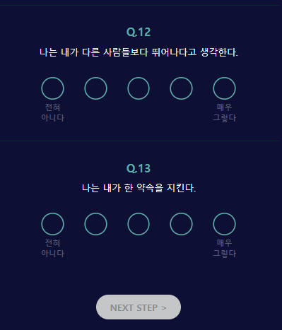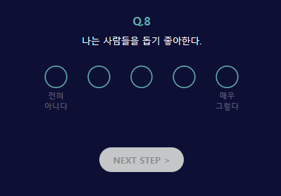 성격 스펙트럼 테스트는 MBTI 성격 유형 테스트와 비슷한 형식으로 문제를 체크하시면 됩니다.