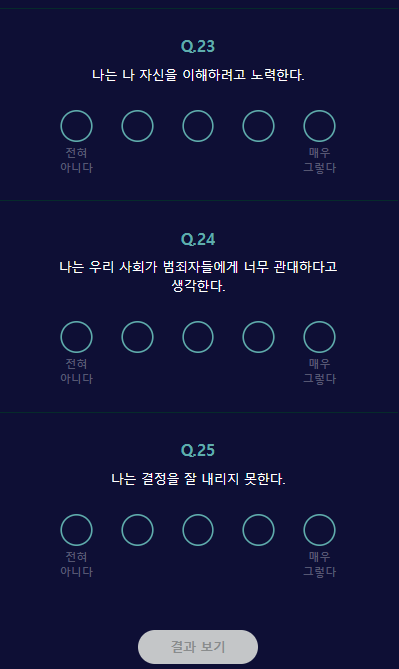 성격 스펙트럼 테스트 문항 수는 총 25문항이며, 소요 시간은 약 3~4분 정도 걸립니다.