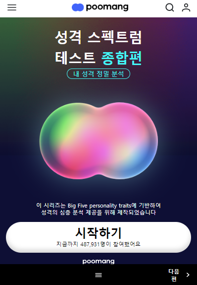 성격 스펙트럼 테스트 종합편(내 성격 정밀 분석)은 푸망(poomang) 홈페이지에서 시리즈로 테스트들이 있으며, 이 시리즈는 Big Five personality traits에 기반하여 성격의 심층 분석 제공을 위해 제작되었다고 합니다.