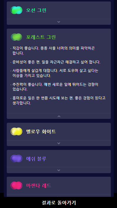 성격 스펙트럼 테스트 결과는 '오션 그린'이 나왔습니다.