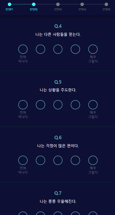 Q.4 나는 다른 사람들을 믿는다. / Q.5 나는 상황을 주도한다. / Q.6 나는 걱정이 많은 편이다. / Q.7 나는 종종 우울해진다. / Q.8 나는 사람들을 돕기 좋아한다.