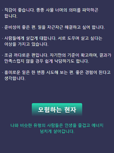 성격 스펙트럼 테스트 결과를 알아보니 얼추 저와 비슷한 내용이 많이 들어 있는 것 같아서 신기하고 재미있었습니다.