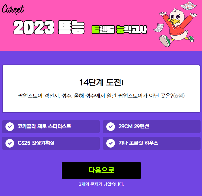 14단계: 팝업스토어 격전지, 성수, 올해 성수에서 열린 팝업스토어가 아닌 곳은? 답: 29CM 29맨션