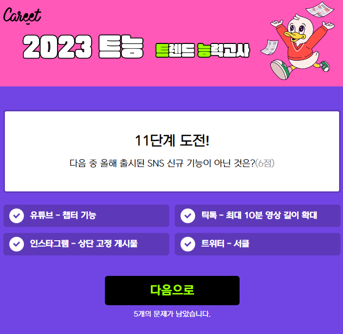 11단계: 다음 중 올해 출시된 SNS 신규 기능이 아닌 것은? 답: 유튜브 - 챕터 기능