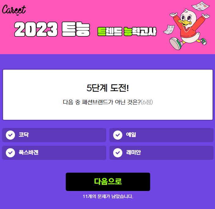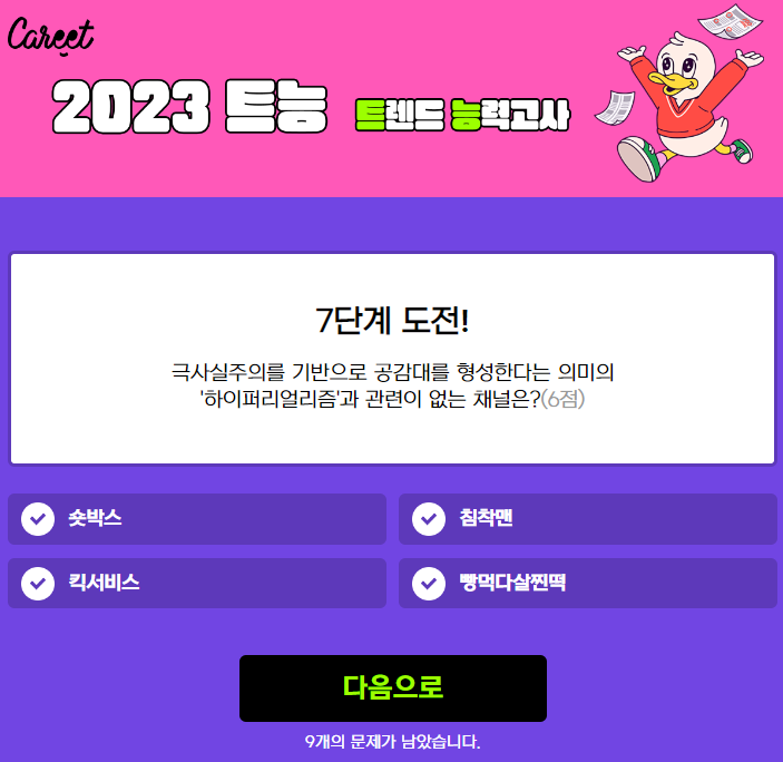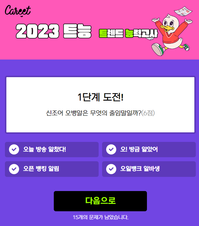 2023 트렌드 능력고사는 캐릿 홈페이지에서 실시 가능하며, 지난 트렌드 능력고사(트능)을 도전해 보실 수 있습니다.