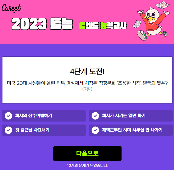 4단계: 미국 20대 사원들이 올린 틱톡 영상에서 시작된 직장문화 '조용한 사직' 열풍의 뜻은? 답: 회사가 시키는 일만하기