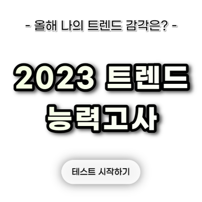 2023 트렌드 능력고사는 올해 나의 트렌드 감각은 과연 어떨지, 그리고 자신의 트렌드 점수(Lv. 레벨)를 알아보실 수 있는 테스트입니다.