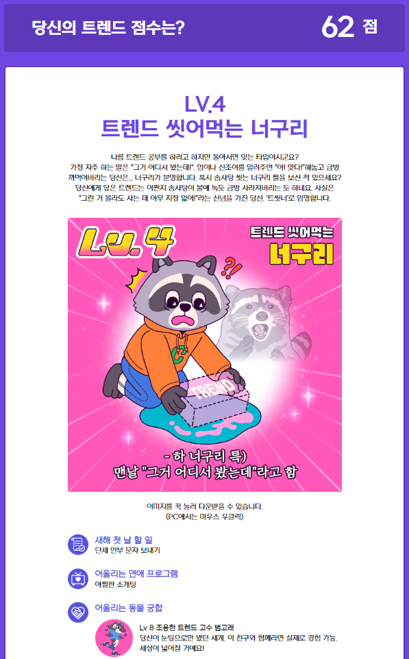 2023 트렌드 능력고사 결과 점수는 62점으로 나왔으며, Lv.4 트렌드 씻어먹는 너구리가 나왔습니다.