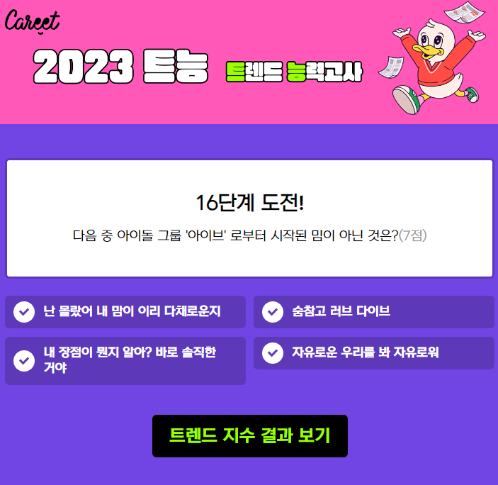 16단계: 다음 중 아이돌 그룹 '아이브'로부터 시작된 밈이 아닌 것은? 답: 자유로운 우리를 봐 자유로워