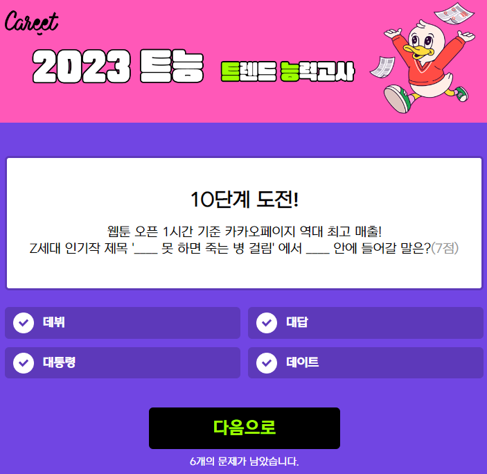 10단계: 웹툰 오픈 1시간 기준 카카오페이지 역대 최고 매출! Z세대 인기작 제목 '_ 못 하면 죽는 병에 걸림'에서 _ 안에 들어갈 말은? 답: 데뷔