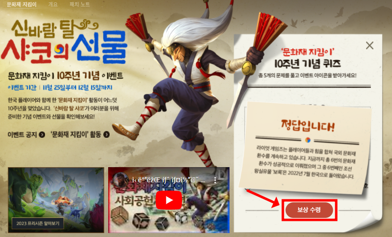 '보상 수령' 버튼을 클릭하여서 문화재 지킴이 10주년 기념 퀴즈 보상을 수령하실 수 있습니다.