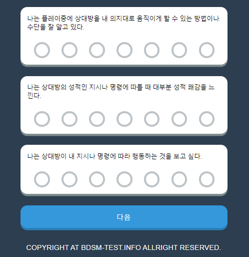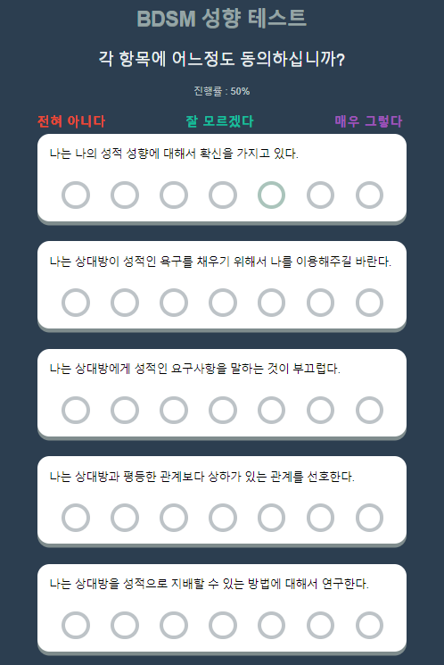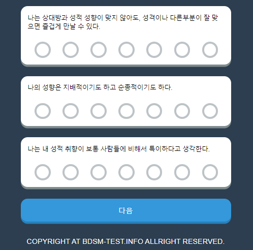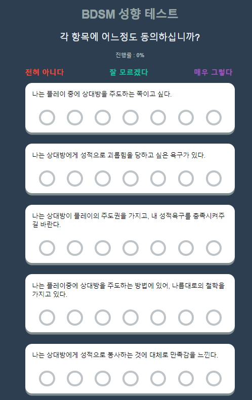 BDSM 성향 테스트는 각 항목 마다 어느 정도인지 동의할 수 있게끔 체크를 해주셔야 합니다.