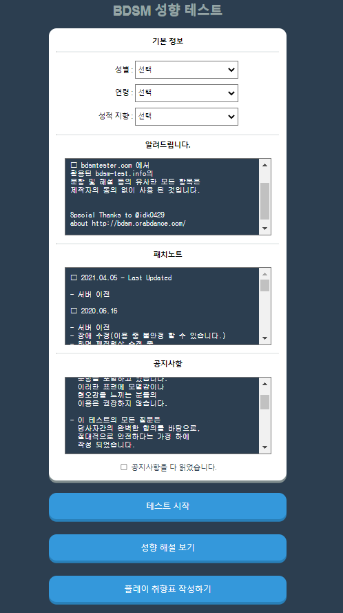 BDSM 성향 테스트 하기 앞서 성적 행위를 노골적으로 묘사하는 문항을 포함하고 있어, 이러한 표현에 모멸감이나 ㅎ며오감을 느끼시는 분들이라면 테스트를 권장하지 않는다고 공지사항에 적혀 있습니다.