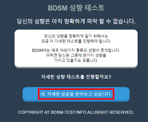 BDSM 성향 테스트 결과 창이 나올 것 같았지만, '당신의 성향은 아직 정확하게 파악 할 수 없습니다'라는 창이 나오며, 계속 진행하고 싶다면 아래의 '네, 자세한 질문을 받아보고 싶습니다.'라는 버튼을 클릭해주시면 됩니다.